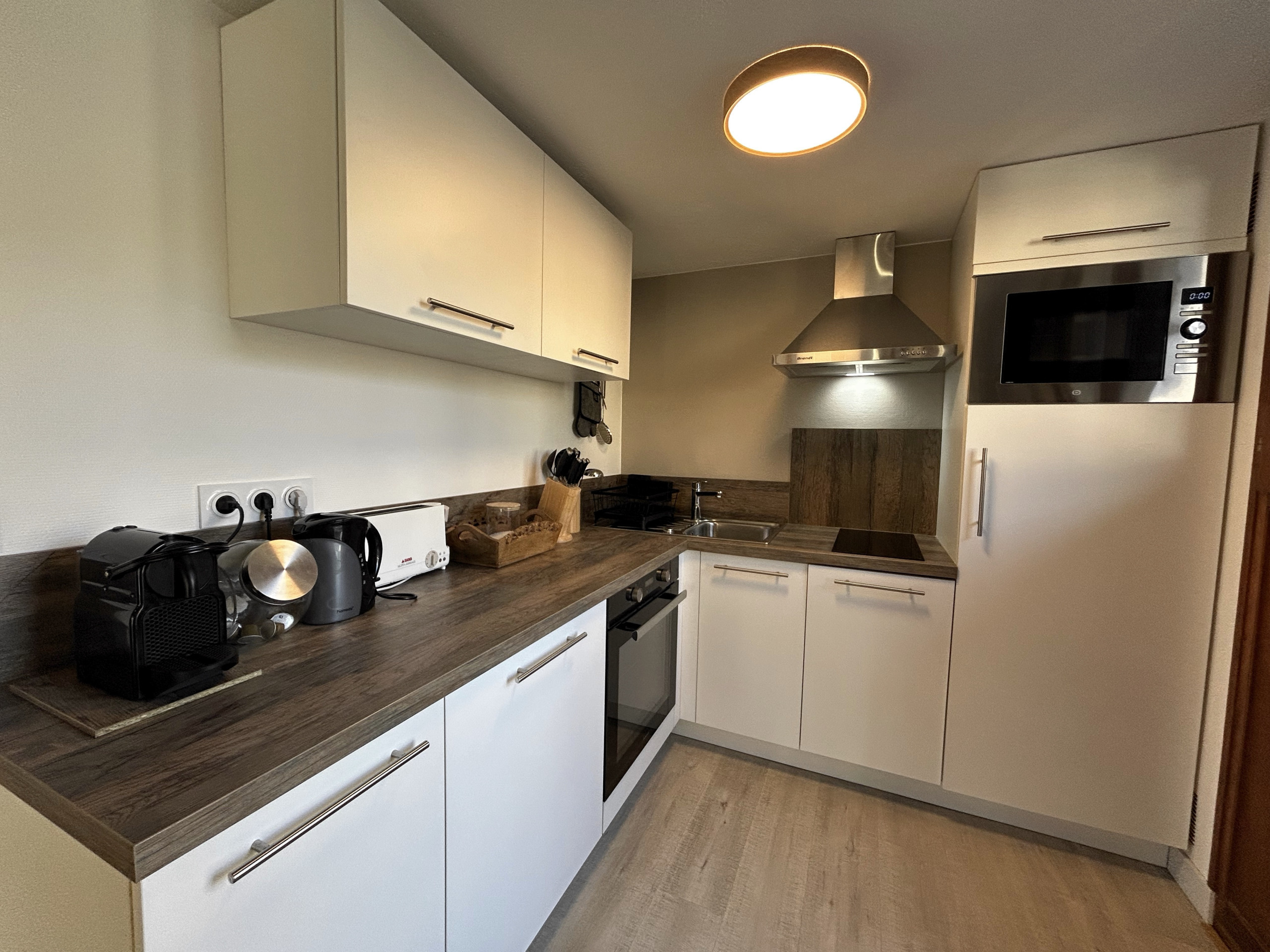 OPEN KITCHEN: 2 induction hobs, refrigerator, oven, dishwasher, microwave, capsule and filter coffee machines, raclette appliance, fondue appliance and hot stone grill, toaster, kettle, all necessary kitchen utensils, French windows leading to an east-facing balcony