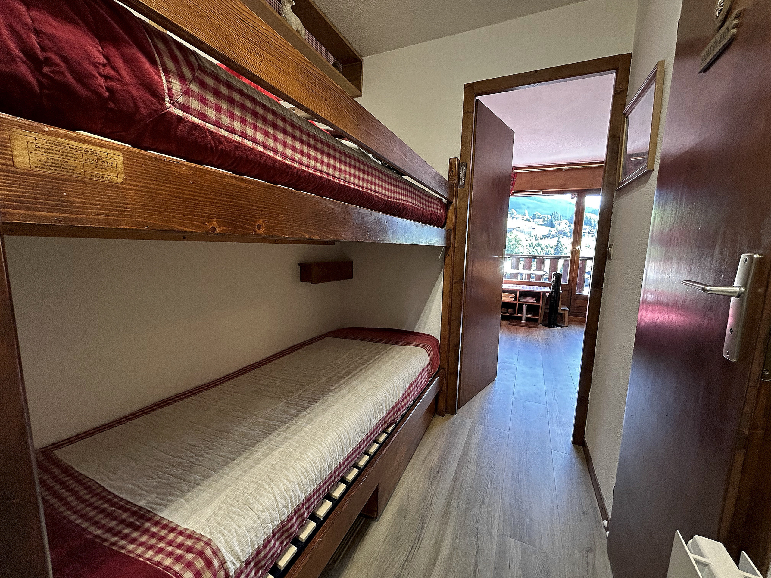 COIN MONTAGNE: 4,59 m2 (sol plastique) 2 lits superposés (80cm) (lit du haut interdit -6ans), tiroirs de rangement, penderie, porte de séparation avec le séjour