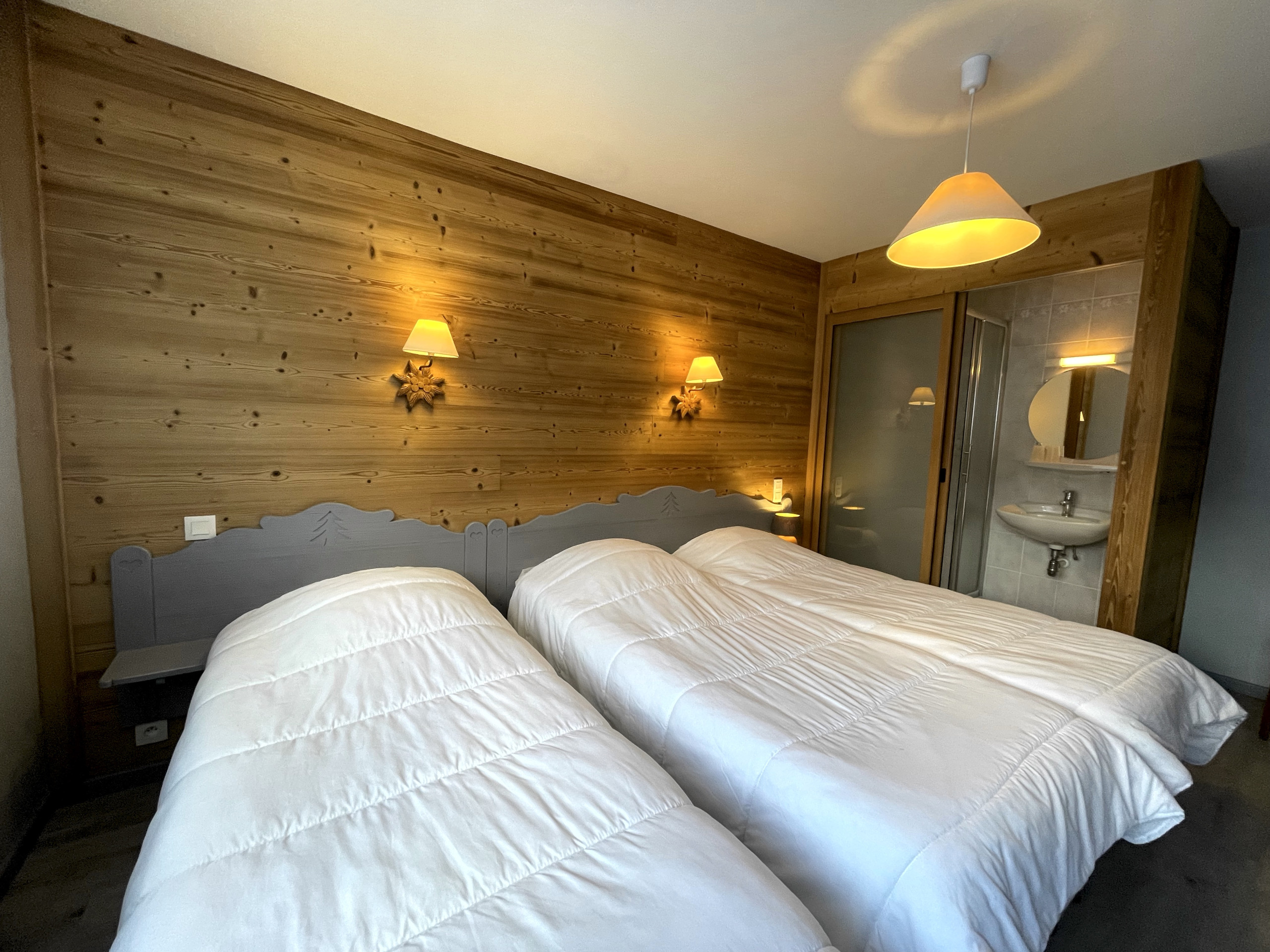 CHAMBRE 2 : 15 m², 3 lits de 80, placard penderie, fenêtre ouest. Cabinet de toilette dans la chambre fermé par une porte coulissante, équipé d'une douche et d'un lavabo.