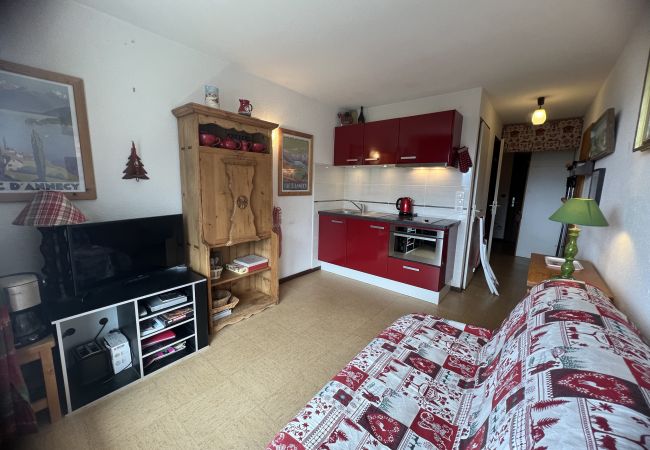 MANIGOD / COL DE MERDASSIER Appartement 1 pièce avec coin nuit équipé pour 4 personnes, d'une surface de 25,46 m2, au niveau plain pied, exposé Sud et ouest. SÉJOUR: un canapé...
